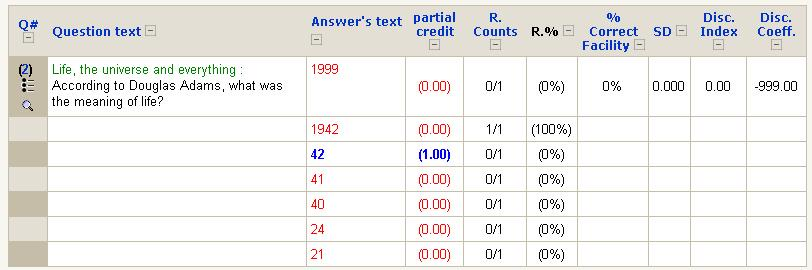 Esta tabla presenta los datos procesados del cuestionario a fin de poder analizar y juzgar el desempeño de cada pregunta de cara a la evaluación. Los parámetros estadísticos utilizados se calculan siguiendo la teoría clásica de los tests. Los parámetros estadísticos usados, están definidos en el enlace de ayuda que hay al lado del título de la tabla, o en el archivo de ayuda \moodle\lang\es_utf8\help\quiz\itemanalysis.html