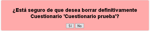 - Confirmar la eliminación del Cuestionario pulsando en el botón de Sí.
