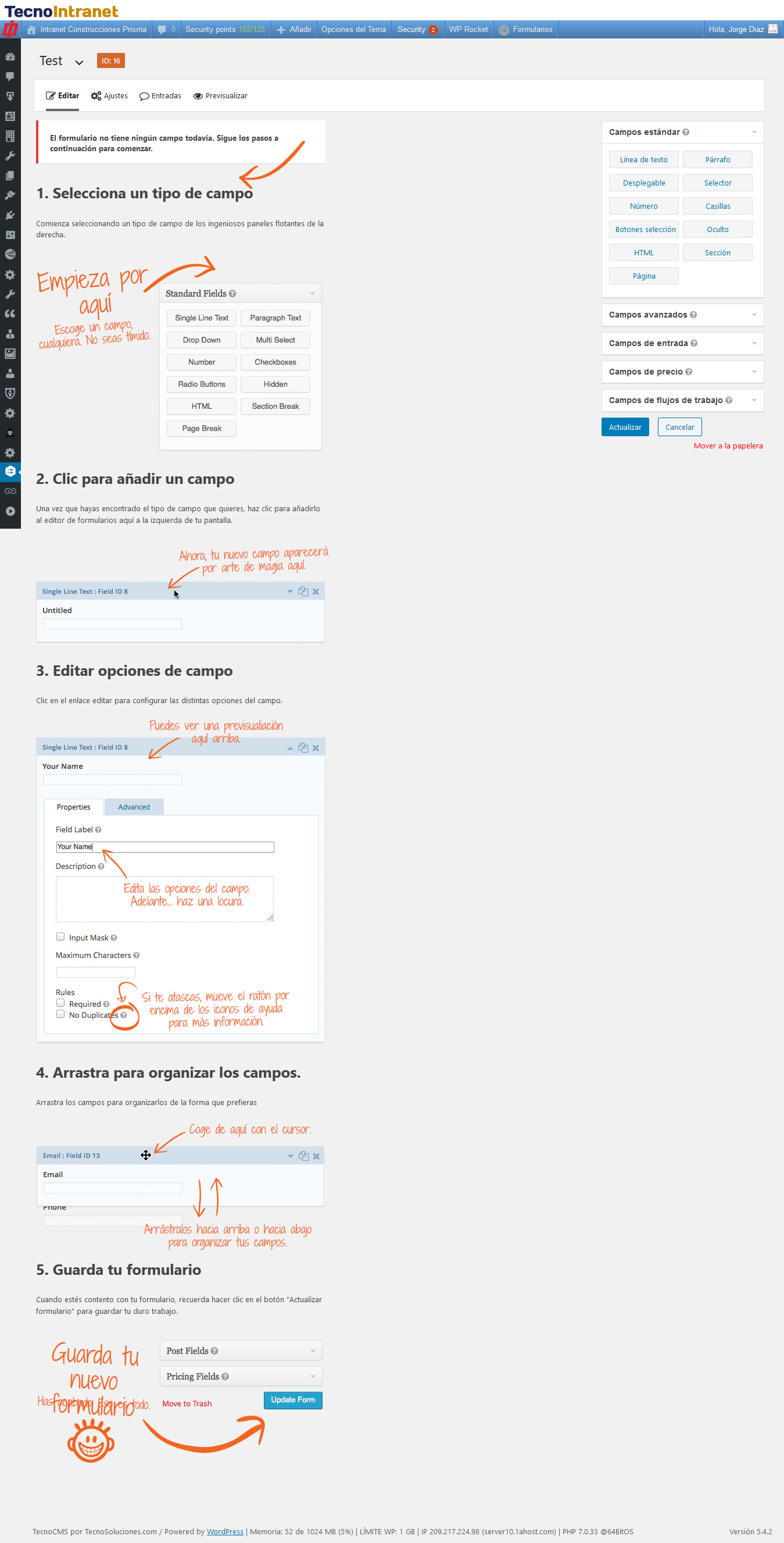 Luego de agregar el nombre y la descripción nos muestra un panel con instrucciones de cómo podemos crear los formularios. Este módulo tiene 3 zonas importantes.