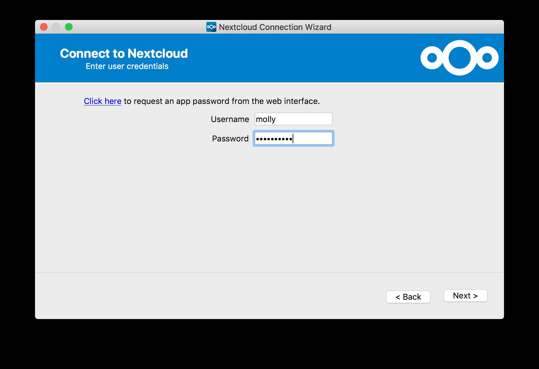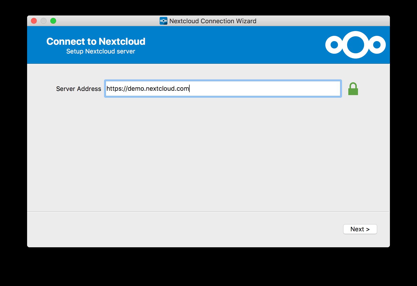 El asistente de instalación lo lleva paso a paso a través de las opciones de configuración y la configuración de la cuenta. Primero debe ingresar la URL de su servidor TecnoCloud.