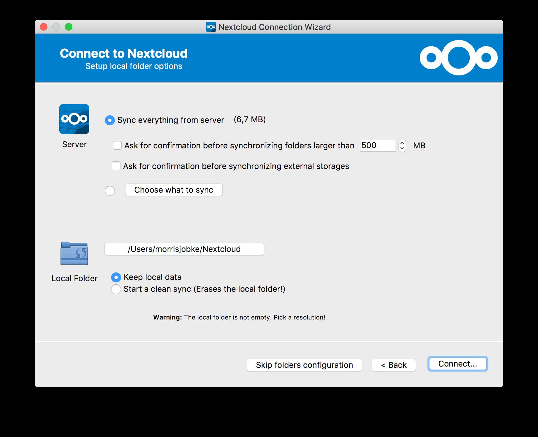 En la pantalla Opción de carpeta local, puede sincronizar todos sus archivos en el servidor de TecnoCloud o seleccionar carpetas individuales. La carpeta de sincronización local predeterminada está TecnoClouden su directorio de inicio. También puede cambiar esto.