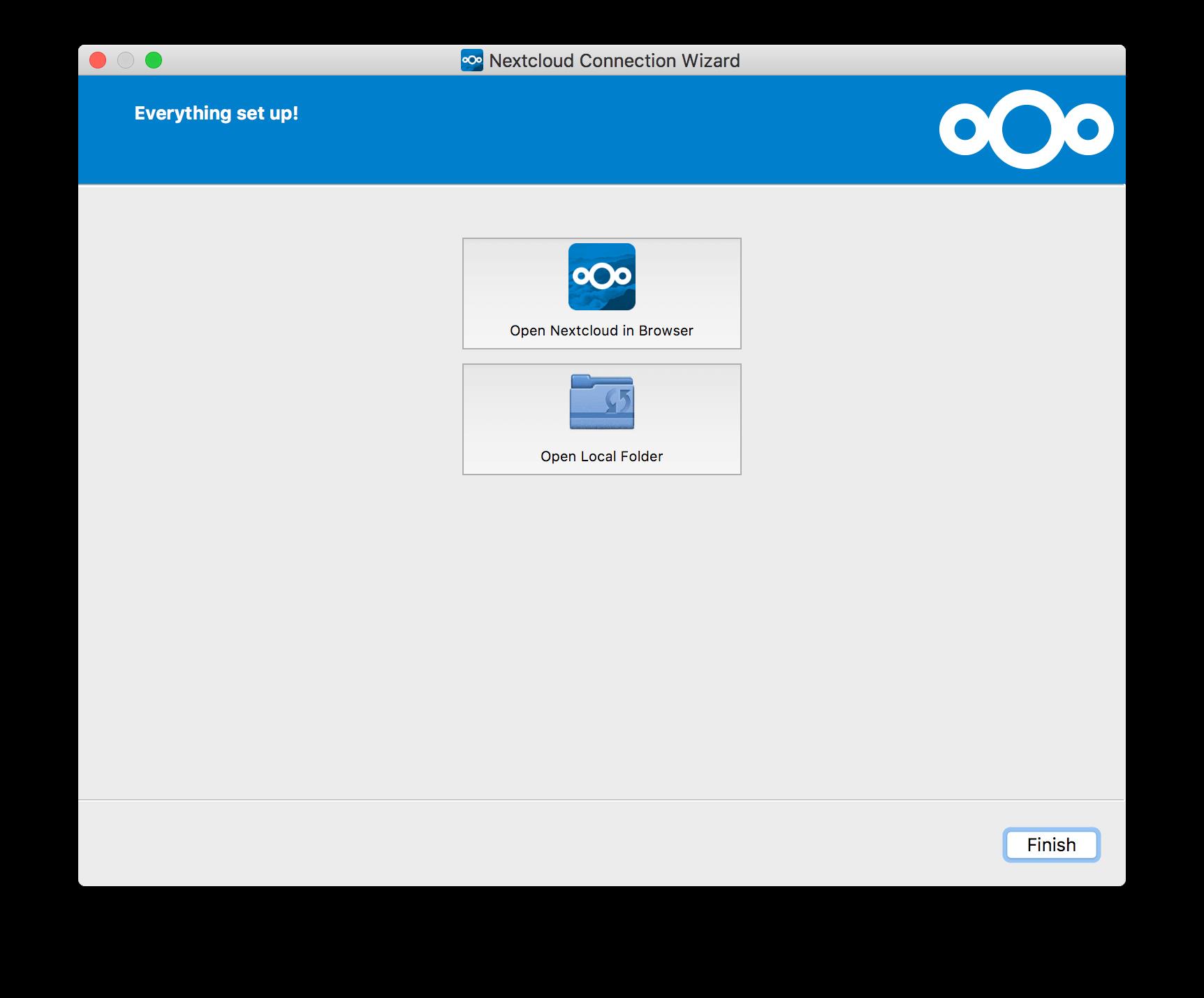Cuando haya terminado de seleccionar sus carpetas de sincronización, haga clic en el botón Conectar en la parte inferior derecha. El cliente intentará conectarse a su servidor TecnoCloud, y cuando lo haga, verá dos botones: uno para conectarse a su GUI web TecnoCloud y otro para abrir su carpeta local. También comenzará a sincronizar sus archivos.