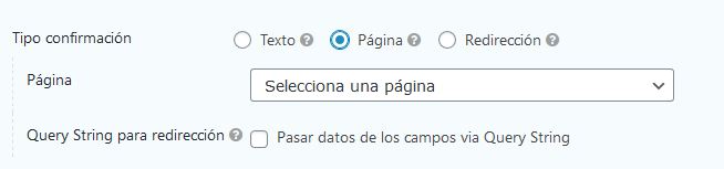 Con la configuración de Página dentro de las opciones de Tipo de confirmación, podrá establecer una página dentro de su sitio a la que se enviará al usuario al enviar el formulario. Para configurar su página de confirmación, use el menú desplegable etiquetado Página para seleccionar la página a la que desea que se envíe al usuario.