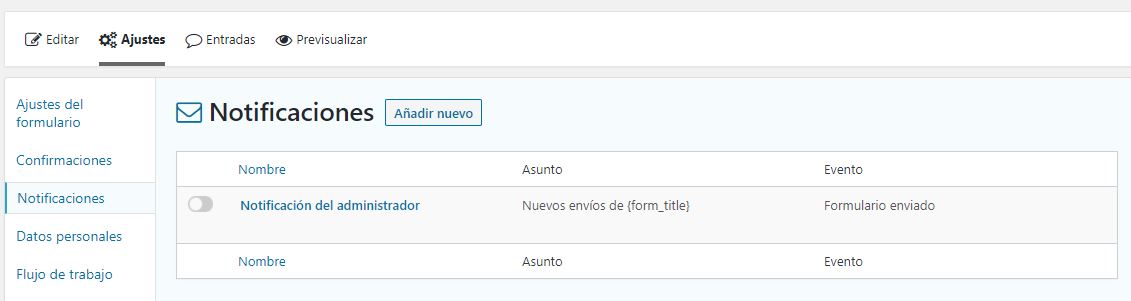 3. Ahora debería ver una lista de todas las notificaciones que existen para ese formulario. De forma predeterminada, ya debería haber una única notificación que envíe los envíos a la dirección de correo electrónico del administrador dentro de su instalación de WordPress. La lista se puede ordenar alfabéticamente haciendo clic en el encabezado ” Nombre“. Para agregar una nueva notificación, haga clic en el botón Agregar nueva.