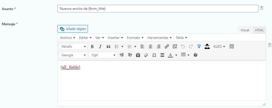6. Los campos Asuntoy Mensaje son la parte más importante de la notificación. Este es el contenido que le permite conocer el contenido del formulario que se completó. Estos tienen por defecto un asunto que indica el formulario que se completó, así como el mensaje que contiene el contenido del formulario. Al igual que muchos de los campos anteriores, estos también admiten etiquetas de combinación para generar contenido de forma dinámica. Para la mayoría de las personas, el contenido predeterminado está bien, pero puede cambiarlo a lo que desee. Con el icono desplegable junto a los cuadros de entrada, puede seleccionar las etiquetas de combinación de los campos del formulario y también las etiquetas de combinación adicionales.