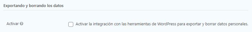 Marque la casilla Habilitar si desea incluir datos de este formulario al exportar o borrar datos personales en este sitio. Una vez que haya marcado la casilla Habilitar, se le presentará un menú desplegable para identificar qué usar para identificar de forma única los datos y una lista de datos disponibles para exportar / borrar.