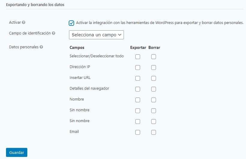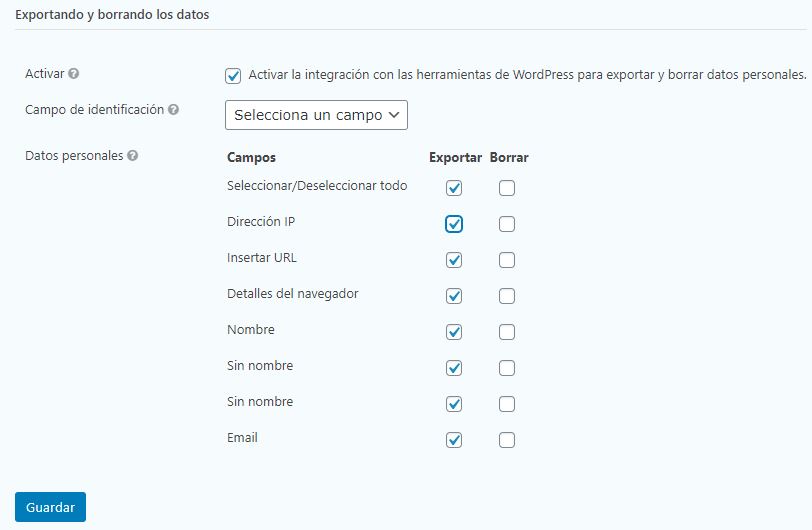 También se mostrará una lista de datos que se pueden marcar para exportar o borrar. Esta lista incluye los campos del formulario, junto con varios datos clave que normalmente se guardan.