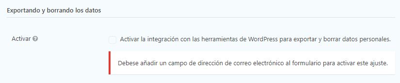 Si no existe una dirección de correo electrónico en el formulario, la opción Habilitar está deshabilitada. La dirección de correo electrónico es necesaria como un medio para identificar los datos que se exportarán / borrarán. Aparecerá el siguiente aviso: