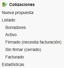- Nueva Propuesta / Nuevo Presupuesto: Se pueden crear Cotizaciones desde esta opción del submenú y también se puede hacer desde la ficha del Cliente, en la pestaña Cliente. Para este tipo de documentos (igual que para facturas, etc.), primero se crea un Borrador, luego se agregan los ítems correspondientes, se revisan los datos, para finalmente validar.