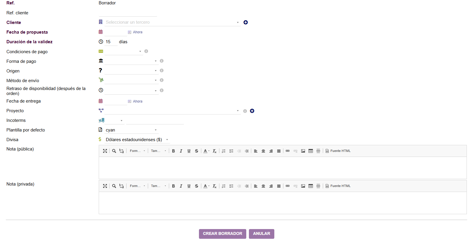 Esta es la ficha que deberemos rellenar para crear el borrador de una Cotización. En ella rellenaremos algunos datos como el cliente al que se le va a realizar el presupuesto, la fecha del presupuesto, la duración de validez del presupuesto o la forma de pago entre otros. Cuando hayamos completado los datos se debe hacer clic sobre el botón Crear borrador. En caso de no querer crear nada, pulsaremos sobre Anular.