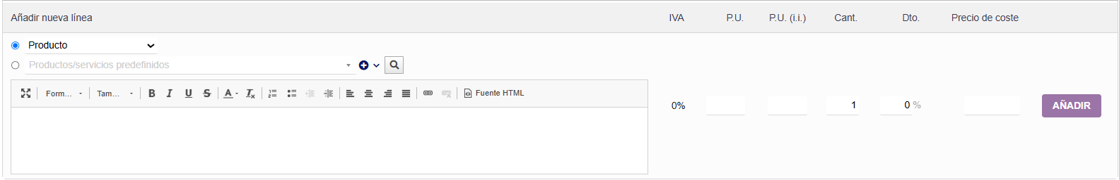 También cabe la posibilidad de querer introducir en la Cotización un producto o servicio que no esté en el sistema. Para ello se selecciona en Entrada Libre el tipo de la línea (producto/servicio) y se coloca la descripción. También se especifica la tasa de IVA, precio unitario, cantidad y descuento. Se registra la línea pulsando en Añadir.