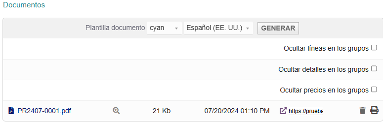 Una vez que la Cotización ha sido validada, es posible enviarla por correo o imprimirla a partir del bloque Documentos que aparece en la parte inferior izquierda. Desde ahí mismo se puede visualizar en pantalla. Se puede usar la plantilla estándar del TecnoERP para generar el documento o también es posible crear una plantilla particular siguiendo los procesos propios de la plataforma y el módulo correspondiente.