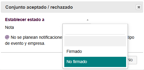 En el cuadro emergente se selecciona el estado a asignar, tendremos que elegir entre cerrarlo con el estado Firmado o No firmado. Se recomienda agregar una nota con la información sobre el por qué de uno u otro estado y pulsar sobre Validar. En caso de no querer cerrarlo pulsaremos sobre Anular.