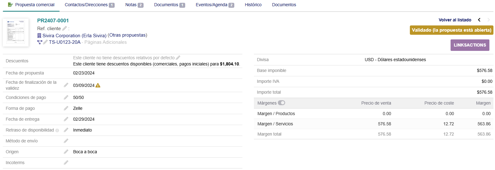 - Pestaña Propuesta comercial: muestra la información general del presupuesto con sus líneas de productos/servicios. También tiene botones para Modificar, enviar email, Anular, Copiar, Eliminar, etc. En caso de que el estado de la Cotización sea Firmado, podremos crear pedidos o facturas a partir del presupuesto. A su vez, muestran los eventos, pedidos, facturas, etc. relacionados con el presupuesto.