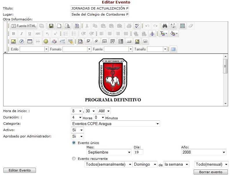 Como se puede observar, se pueden cambiar datos como: Título, lugar, Información Adicional / Detalles, horario, si va a estar activo / aprobado o no y, finalmente, si es un evento único o recurrente con sus detalles de fechas.
