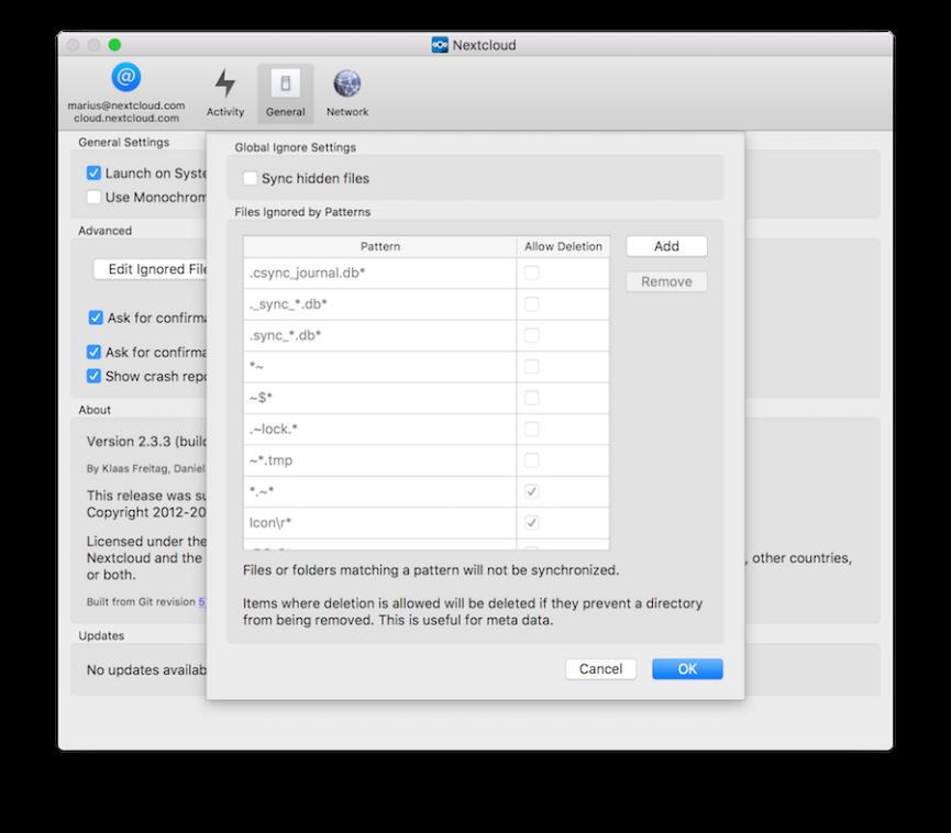 Además de esta lista, TecnoCloud Client siempre excluye los archivos con caracteres que no se pueden sincronizar con otros sistemas de archivos.