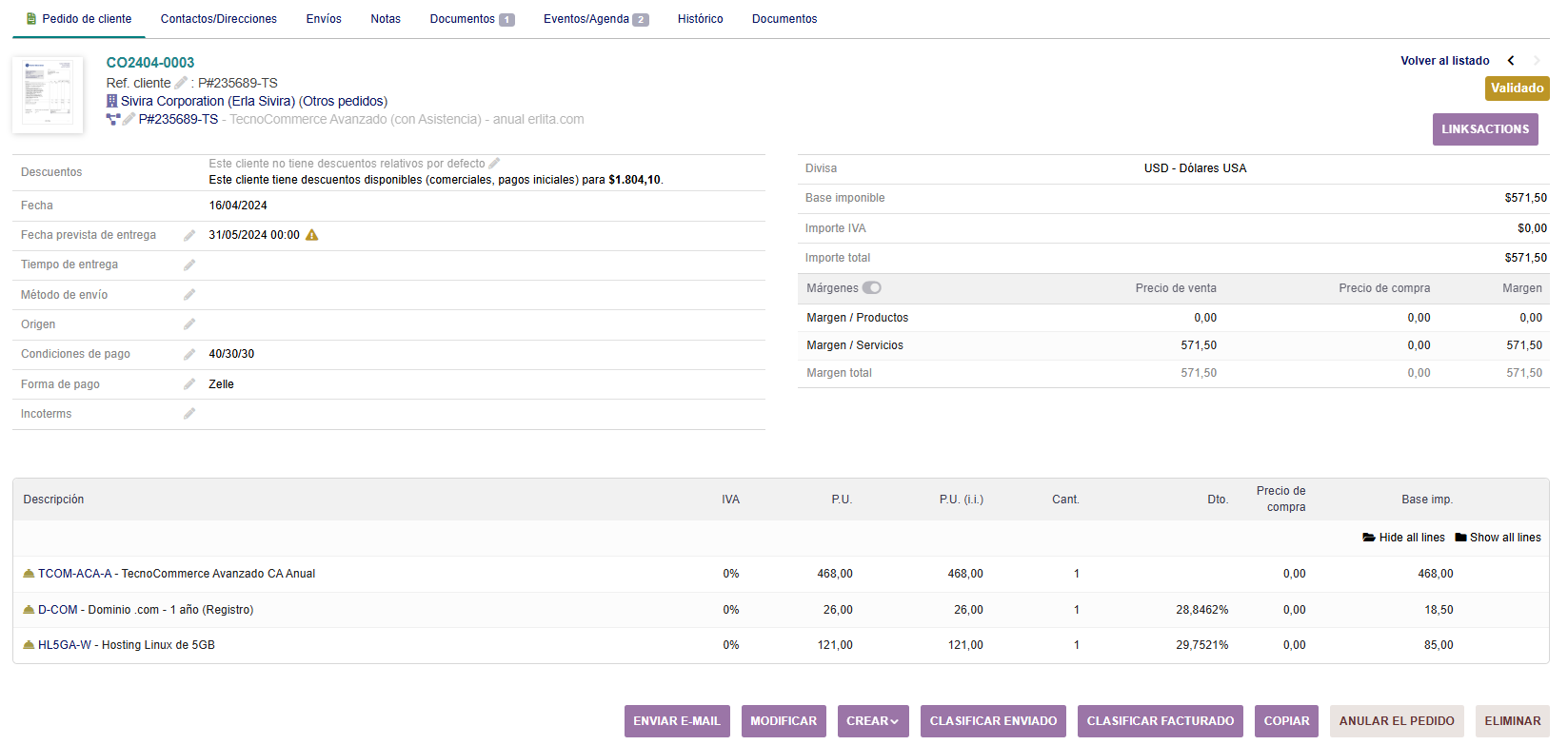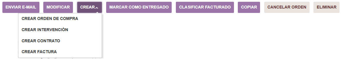 - Pestaña Pedido de Cliente: muestra información general sobre el Pedido del cliente con las líneas que lo componen y sus precios. También es posible Modificar, Crear (Pedido a proveedor, factura, intervención o contrato), Clasificar Enviado, Copiar, Anular el Pedido o Eliminar.