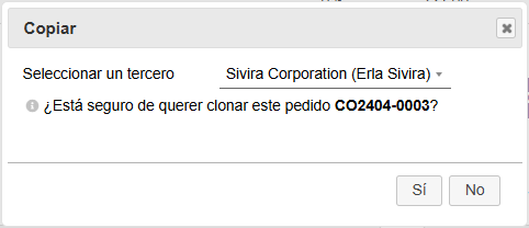 - Copiar un Pedido de Cliente: Para copiar un pedido de cliente, lo primero será acceder a la ficha del Pedido que usaremos como base. Una vez en la ficha del Pedido, pulsaremos sobre el botón Copiar/Clonar. Tras esto, elegiremos cuál es el Tercero que nos va a hacer el pedido en el desplegable y finalmente pulsaremos “Sí”. En caso de no querer hacer nada, pulsaremos sobre “No”.