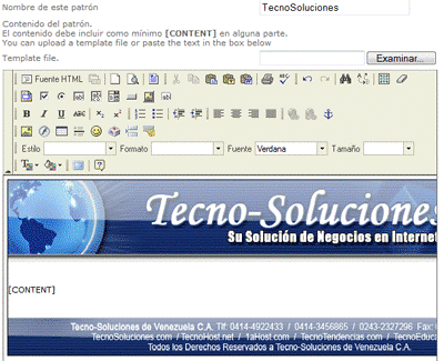 TecnoMercadeo permite definir patrones que después puede utilizar para enviar correos a las listas. Un patrón es una página HTML en la que está incluido el Marcador [CONTENT]. En dicho lugar se insertará el texto del mensaje.