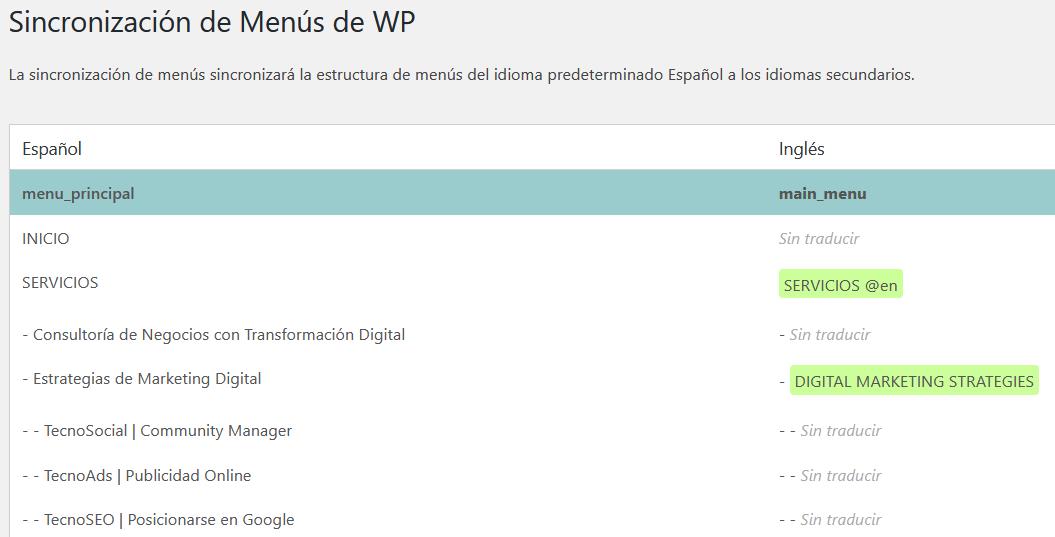 - Después de sincronizar los menús, deberá dirigirse nuevamente a la página WPML -> Sincronización de menús de WP.