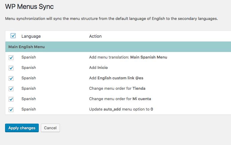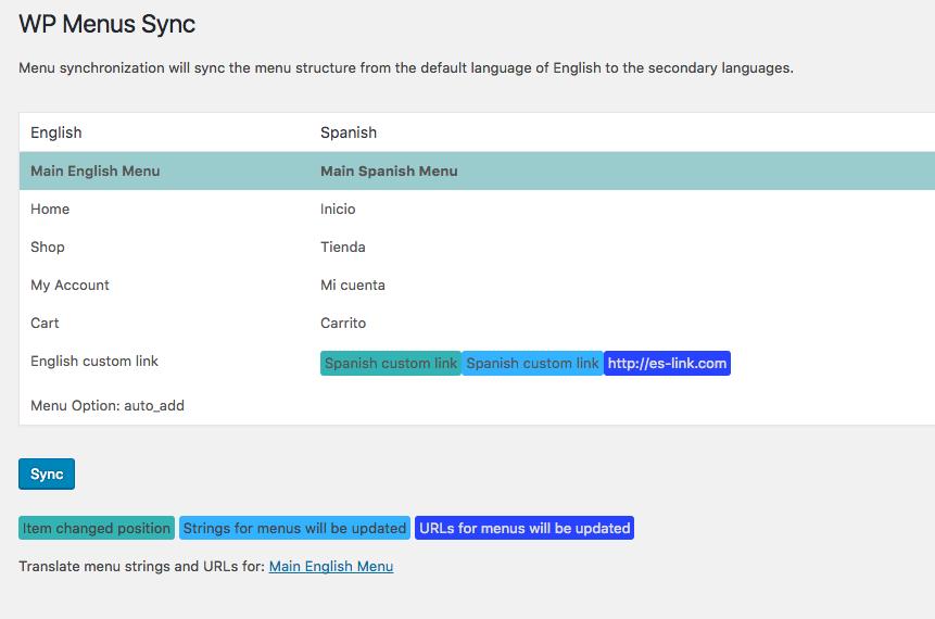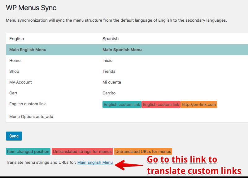 - Diríjase a la página WPML -> Sincronización de menús de WP y ejecute la Sincronización una vez más para actualizar los enlaces de menú traducidos y las etiquetas.