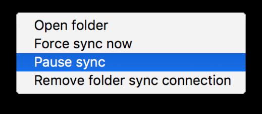 Pause Sync pausa las operaciones de sincronización sin realizar ningún cambio en su cuenta. Continuará actualizando listas de archivos y carpetas, sin descargar ni actualizar archivos. Para detener toda la actividad de sincronización, utilice Eliminar conexión de sincronización de carpetas .