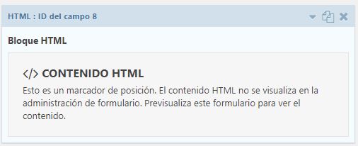 El campo HTML le permite colocar un bloque de HTML de forma libre en cualquier lugar de su formulario. Esto es útil para agregar imágenes o contenido adicional. Está disponible en la sección Campos estándar dentro del editor de formularios.