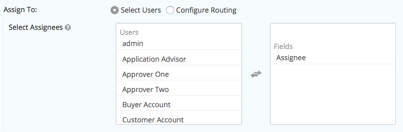 Una vez que haya agregado el campo de flujo de trabajo al formulario, deberá usarlo en la configuración de un paso de flujo de trabajo. Por ejemplo, asigne un paso de aprobación al usuario seleccionado en el campo Asignatario.
