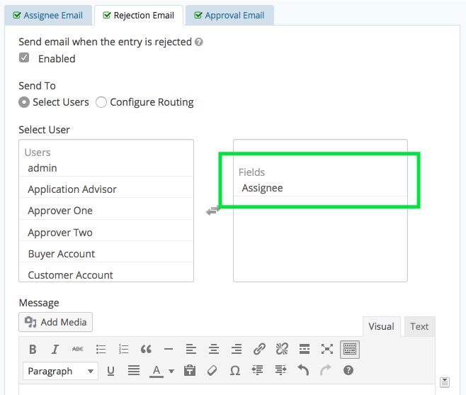 También puede seleccionar el campo Asignatario para el destino de los correos electrónicos de aprobación y rechazo.
