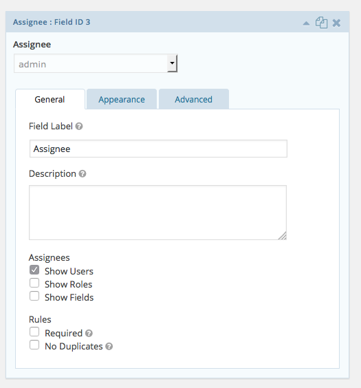 Cuando agrega un campo de Encargado al formulario, se verá como un campo desplegable estándar, pero tendrá todos los Usuarios y Roles del portal en la lista listos para ser seleccionados.