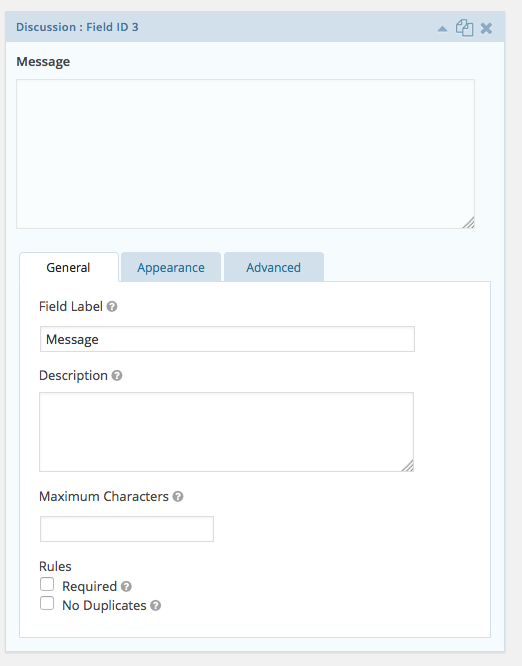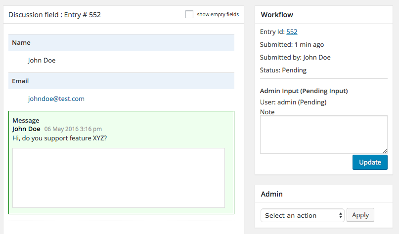 Esto significa que el remitente del formulario puede iniciar una discusión. Si oculta el campo usando la configuración de Visibilidad (solo administrador), entonces no estará disponible en el formulario de front-end, pero será visible en todos los pasos del flujo de trabajo. El campo también admite lógica condicional. Nota: Si usa lógica condicional, probablemente querrá habilitar ‘Lógica condicional de campo’ en la configuración del paso de entrada del usuario.