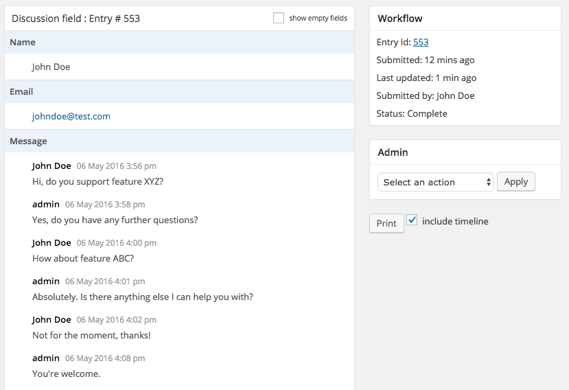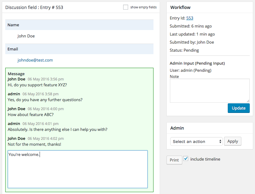 El campo Notas nos permite agregar comentarios a la línea de tiempo, sin embargo, la línea de tiempo puede estar un poco abarrotada y, a veces, es útil para administrar conversaciones dentro de la entrada o agregar varias conversaciones. El campo de discusión proporciona una forma para que los usuarios mantengan una conversación dentro de un campo de formulario, lo que significa que se puede usar en etiquetas de combinación, lógica condicional y exportar junto con el resto de los valores de entrada.