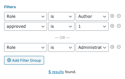 Cree grupos de condiciones que filtren qué objetos se completan en el campo. Agregue una condición a su grupo con los íconos (+) / (-) a la derecha. Todas las condiciones en un grupo deben ser verdaderas para que el grupo coincida. Agregue otro grupo haciendo clic en “Agregar grupo de filtros”. Los objetos que coincidan con cualquier grupo se completarán en el campo.