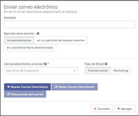 En la acción de enviar correo electrónico, hay una opción para seleccionar Transaccional o Marketing. Un correo electrónico transaccional es uno que puede ser enviado al contacto varias veces. Un correo electrónico de marketing es uno que solo se puede enviar al contacto una vez a través de múltiples fuentes (por ejemplo, otra campaña). Si el contacto ya ha recibido este correo electrónico de otra fuente o la actual campaña, el correo electrónico no se enviará de nuevo y el contacto simplemente avanza a través de la campaña.
