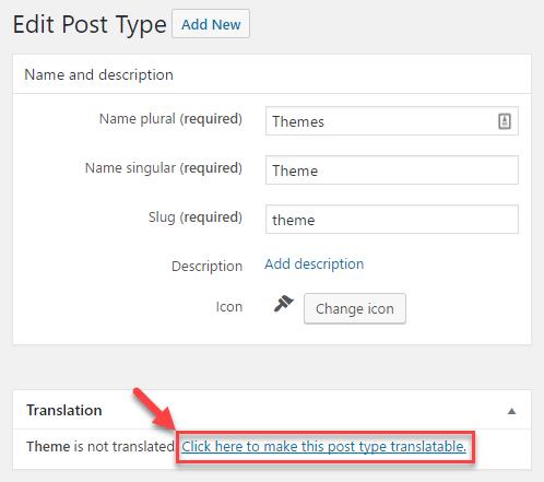 Diríjase a Types y edite un tipo de entrada personalizada. Si no está habilitado para traducción de nombres, verá un enlace a la pantalla de configuración de WPML: