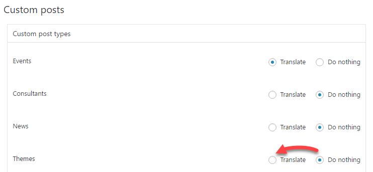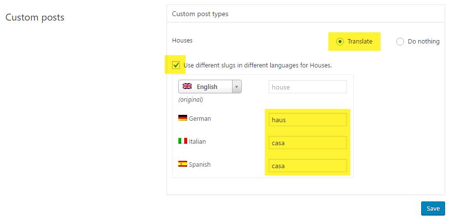 Ahora ya puede traducir los nombres de tipos de entradas personalizadas. Introducir sus traducciones, pulsar Guardar y aparecerán en las URL.