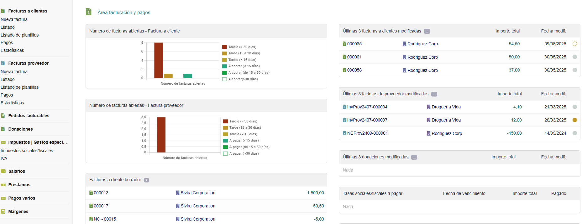 - Desde el submenú Lateral Izquierdo: podemos gestionar las Facturas a Clientes, Facturas de Proveedores, Pedidos Facturables (podremos agrupar en una sola factura varios pedidos que estén en estado a facturar), Donaciones, Impuestos, Salarios, Préstamos, Pagos varios y Márgenes. En cada uno se pueden crear nuevos, ver estadísticas y listados de lo existente, todos con opciones para ser modificados o eliminados.