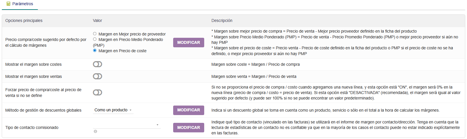 Se recomienda previamente hacer las configuraciones de los parámetros básicos del Módulo Márgenes, esto se hace en: Menú Inicio à Configuración à Módulos, se ubica el bloque “Módulos financieros (Contabilidad/tesorería)” y el subtítulo “Márgenes”.