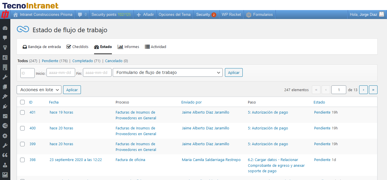 La página de estado es el lugar para encontrar todos los flujos de trabajo enviados. De forma predeterminada, los usuarios solo verán sus propios formularios. Los administradores verán todos los formularios.
