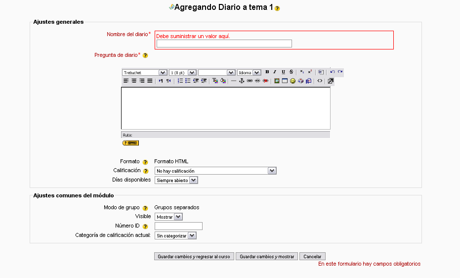 - Nombre: es el nombre, corto e identificativo, con el que aparecerá el diario en la página del curso. Conviene que sea descriptivo e indique si está asociado a alguna otra actividad. Se pueden incluir marcas HTML para lograr efectos de estilo en el texto.