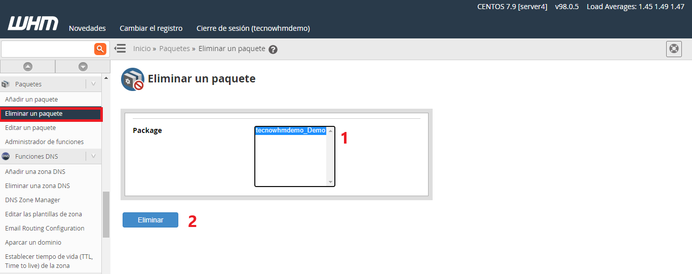 - No puede eliminar un paquete que utiliza actualmente una cuenta en su servidor.