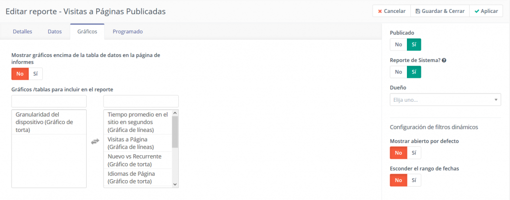 Algunos informes tienen gráficos disponibles. Seleccione el gráfico deseado de la lista de la izquierda para que este se mueva a la derecha y sea parte del informe.