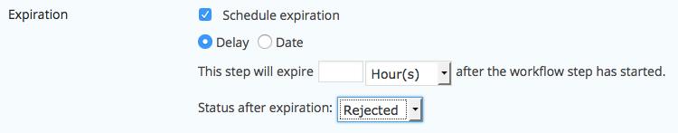 Los pasos de aprobación pueden programarse para expirar. Una vez que un paso expira, la entrada se enviará al paso configurado en la (s) configuración (es) del siguiente paso. La configuración de Caducidad en el Paso de aprobación permite especificar el estado una vez que el paso ha caducado.