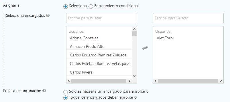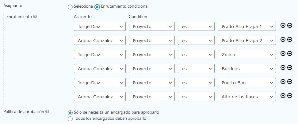 La segunda opción de “Asignar a“, “Enrutamiento condicional“, también permite que se asignen varios asignados al paso, sin embargo, la lista de asignados se genera dinámicamente en función de los valores del campo.