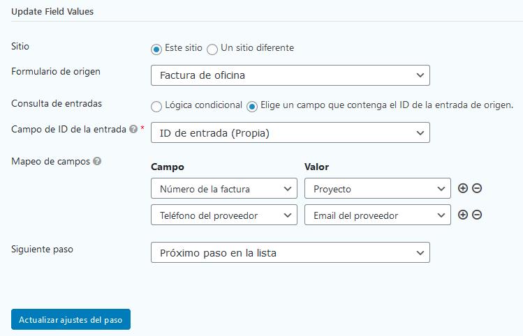Si el ID de la entrada no existe dentro del Formulario de origen elegido, el paso no actualizará la entrada actual.