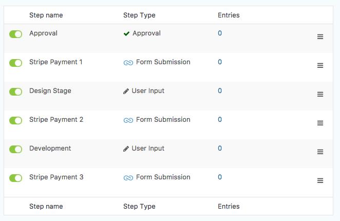 Por ejemplo, un flujo de trabajo que lleva a un cliente a través de todo el proceso de un proyecto, desde los requisitos iniciales hasta la entrega final, puede requerir pasos de pago al principio, a la mitad y al final. El paso Envío del formulario esperará hasta que se haya recibido el pago antes de permitir que el flujo de trabajo continúe con el siguiente paso.