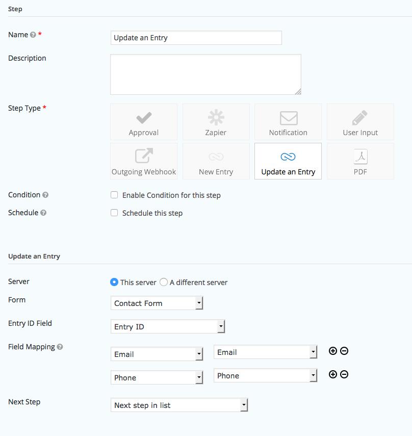 Para agregar una “Actualización de una entrada“, configure los ajustes de paso estándar y seleccione el formulario de destino. Seleccione el campo en el formulario actual que se utilizará como fuente para el ID de entrada de destino. Este campo, por ejemplo, podría ser un campo numérico que se establece como solo administrador y se completa previamente con el valor de un parámetro de URL. La configuración de Asignaciones de campos define qué campos del formulario de destino deben actualizarse y qué campos del formulario actual deben usarse como origen. Seleccione “Valor personalizado” para especificar un valor estático, una etiqueta de combinación o una combinación de ambos.
