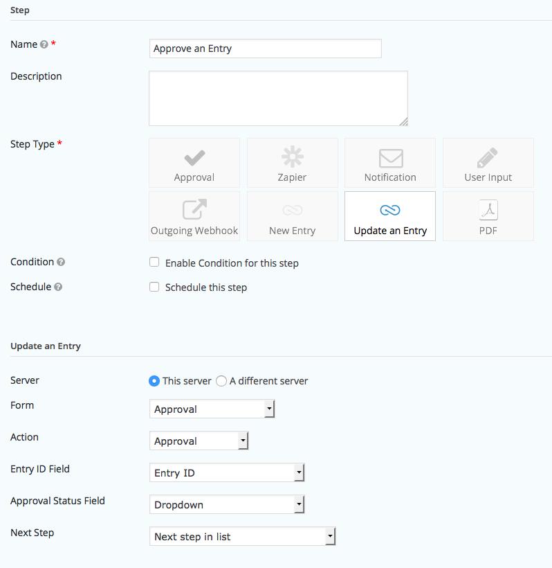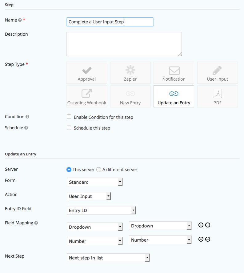 El conector de formulario puede procesar un paso de flujo de trabajo de una entrada diferente. Esta acción es como la acción ‘actualizar una entrada’, excepto que el estado del paso de entrada del usuario se establecerá en ‘completo’. El paso actual para la entrada de destino debe ser un paso de entrada de usuario y el usuario actual debe ser un asignado; de lo contrario, este paso no tendrá ningún efecto.
