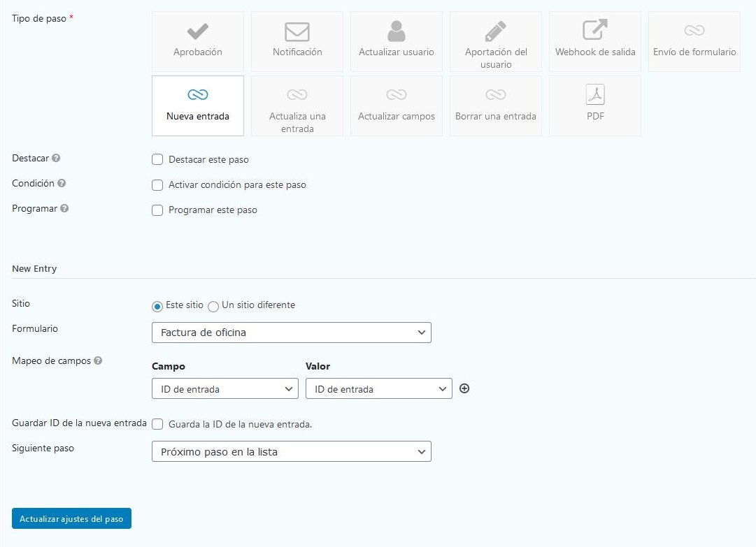 Agregue un paso de “Nueva entrada“, configure los ajustes de paso estándar y seleccione su formulario de destino. Utilice la asignación de campo para configurar los valores que estarán en la nueva entrada. Asigne un campo de la lista de campos de destino a la izquierda a un campo de origen a la derecha. Cuando se procesa este paso, los valores de entrada contenidos en los campos mapeados se utilizarán para crear una nueva entrada para el formulario de destino.