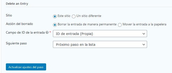 Si desea eliminar una entrada diferente, simplemente seleccione el campo en la configuración “Campo de ID de entrada” que contiene el ID de la entrada que desea eliminar.